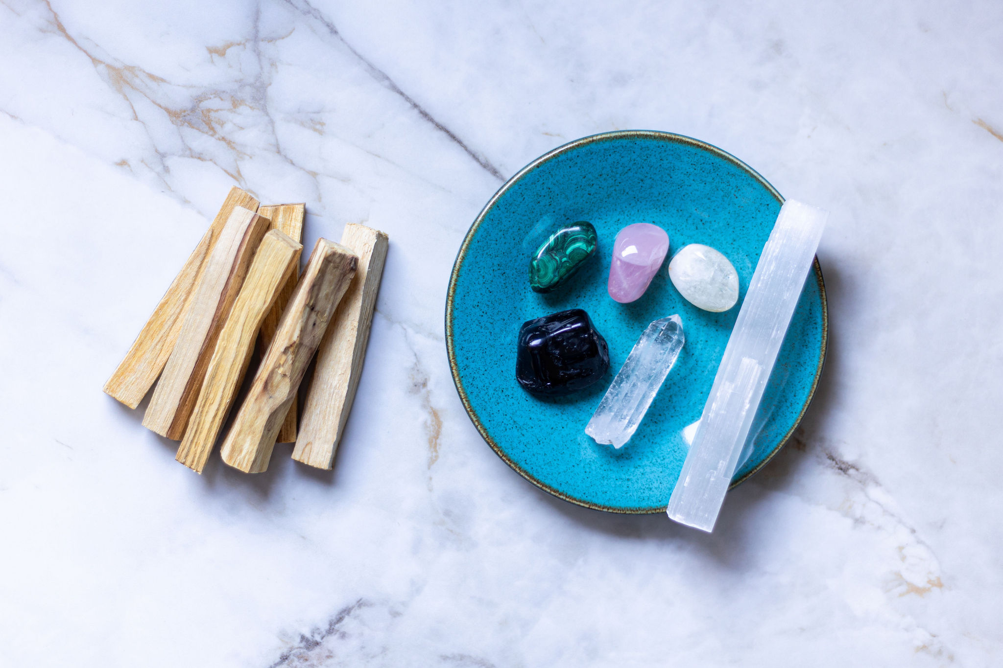 Common tools used in energy cleansing include sage bundles, palo santo, incense, crystals (such as selenite or clear quartz), and sound (like singing bowls or bells).